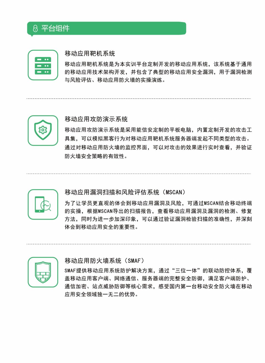 移动应用安全实训平台着重培养移动应用安全的知识与技能,提升移动应用安全意识,普及移动应用安全知识。除了漏洞扫描、渗透测试、移动应用防护等教学功能,平台还带有移动应用服务器端和客户端,能定制各种类型移动应用风险评估和应用防护演练,通过组织实训提升学生学习兴趣,加快推进移动应用安全产学研结合,将实训的成果转化为现实生产力。
