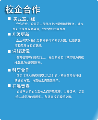 云计算大数据随着云计算大数据技术的不断发展成熟,云计算大数据技术人才需求再不断的扩大,云计算大数据软件开发工程师,云计算大数据系统架构工程师,云计算大数据运维工程师,云计算大数据测试工程师等职位需求量剧增,本产品正是以云计算大数据相关职业技能培养为目标,快速辅助学校建设云计算大数据教学环境及云计算大数据实验教学体系,为培养学校构建云计算大数据相关课程实验及实训环境。