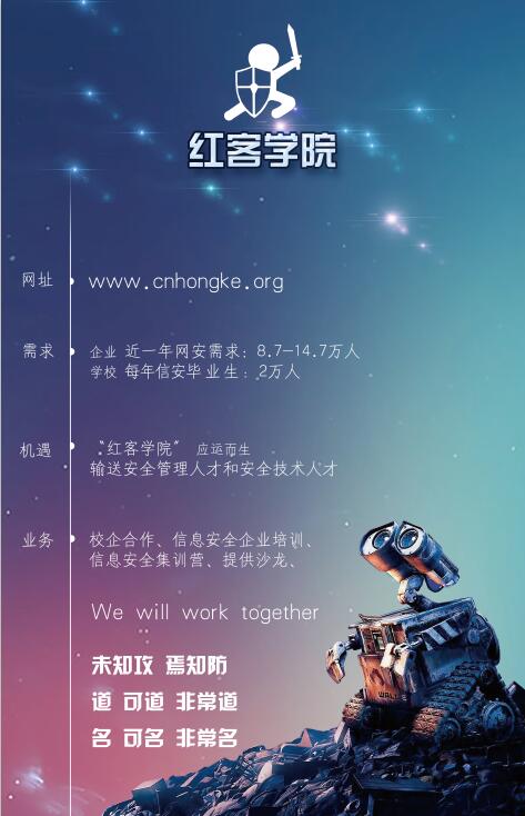 红客学院:希望能为推动信息安全技术的发展作出贡献,探索和涉足信息安全的未来,培养一批富有正义感的信息安全力量,打造成中国信息安全的预备役人才培养基地。