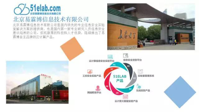 北京易霖博信息技术有限公司(51ELAB)是国内领先的信息安全综合实训平台解决方案提供商,是国内拥有自主品牌和知识产权的专业信息安全公司。易霖博2013年进入国内信息安全实训市场,秉承“安全实训、虚实结合、课程丰富、人才培养”的理念,立足自主研发与持续创新,为用户提供智能、安全、内容丰富的实训产品、解决方案和优质的服务。
